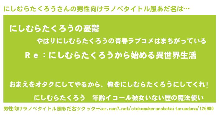 | 意味不明あだ名 | 『自称にしむらたくろう』 |