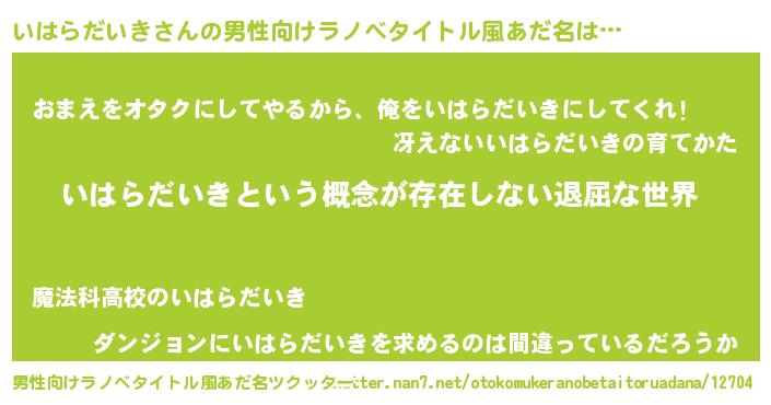 | 胡散臭い通販商品みたいなあだ名 | 『来世でも幸せになれる水素水…その名も「いはらだいき」』 |