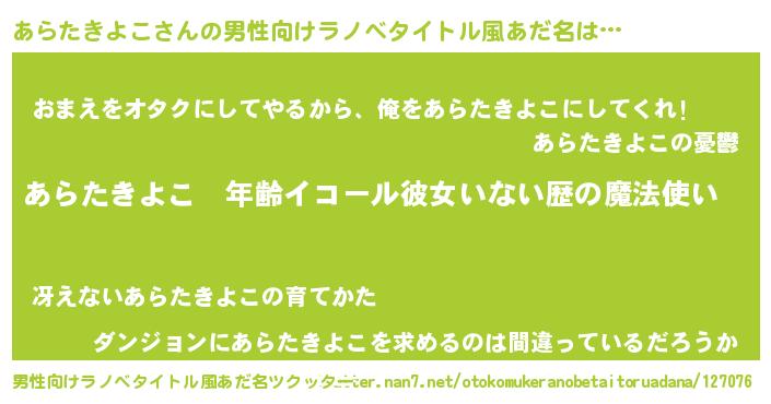 | 伝説のあだ名 | 『救世主となる錬金術士あらたきよこ』 |