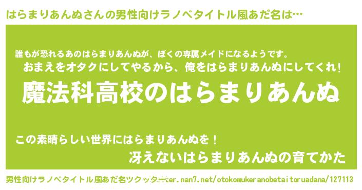 | 女子向けラノベタイトル風あだ名 | 『はらまりあんぬなんてお断りですっ。』 |