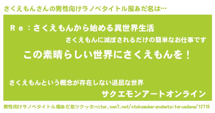 | 女子向けラノベタイトル風あだ名 | 『悪役さくえもんに転生したようですが、知った事ではありません』 |