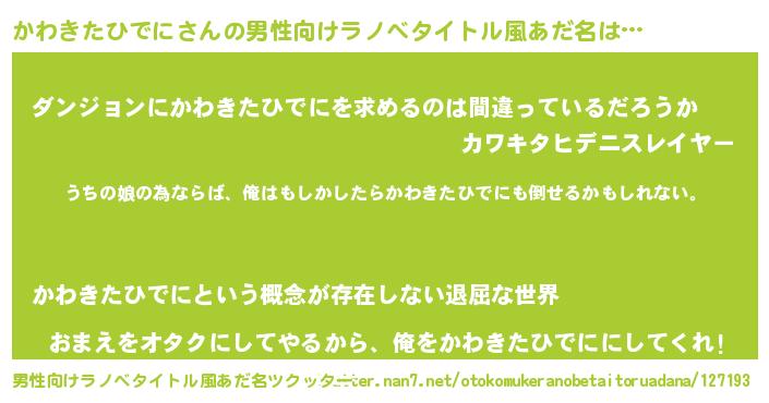 | 女子向けラノベタイトル風あだ名 | 『かわきたひでにの婚約者』 |