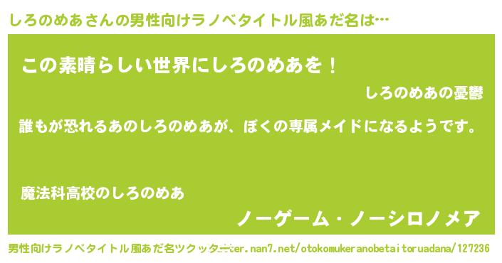 | 女子向けラノベタイトル風あだ名 | 『異世界でカフェしろのめあを開店しました。』 |