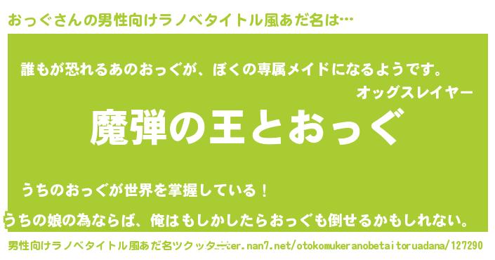 | 女子向けラノベタイトル風あだ名 | 『おっぐが死なない童話 林檎のおっぐの診療簿』 |