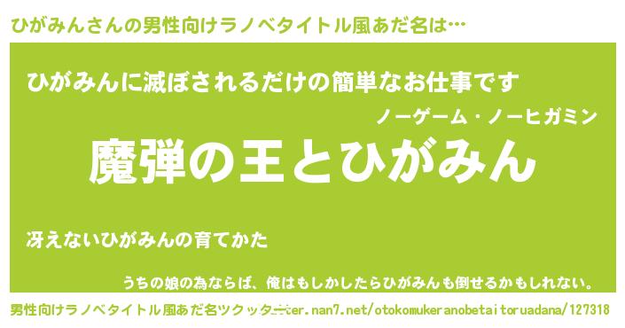 | 女子向けラノベタイトル風あだ名 | 『ひがみんが死なない童話 林檎のひがみんの診療簿』 |