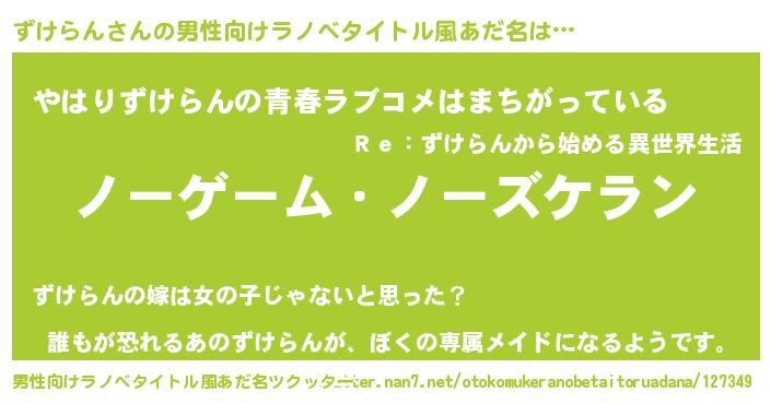 | 女子向けラノベタイトル風あだ名 | 『死神ずけらんの再婚』『闇のずけらん』 |