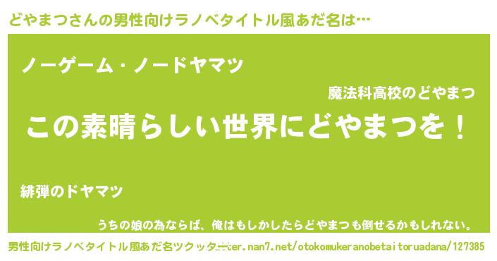 | 女子向けラノベタイトル風あだ名 | 『悪役どやまつに転生したようですが、知った事ではありません』 |