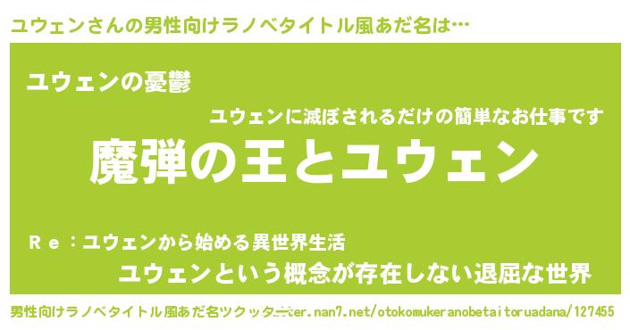 | 意味不明あだ名 | 『住所不定無職ユウェン(2歳)』 |