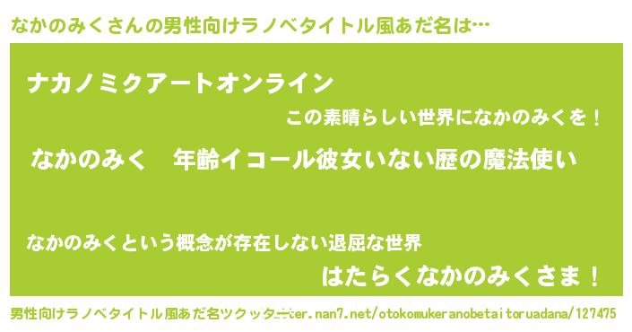| 女子向けラノベタイトル風あだ名 | 『なかのみくの玉の輿計画!』 |