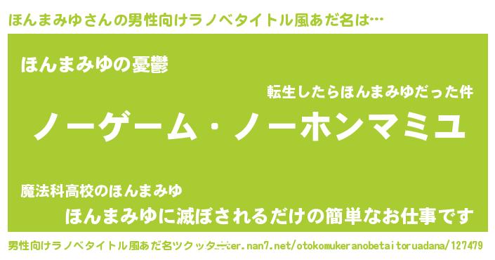 | 女子向けラノベタイトル風あだ名 | 『死神ほんまみゆの再婚』 |
