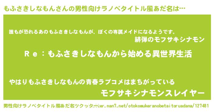 | 意味不明あだ名 | 『自称もふさきしなもん』 |
