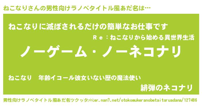 | 女子向けラノベタイトル風あだ名 | 『死神ねこなりの再婚』 |