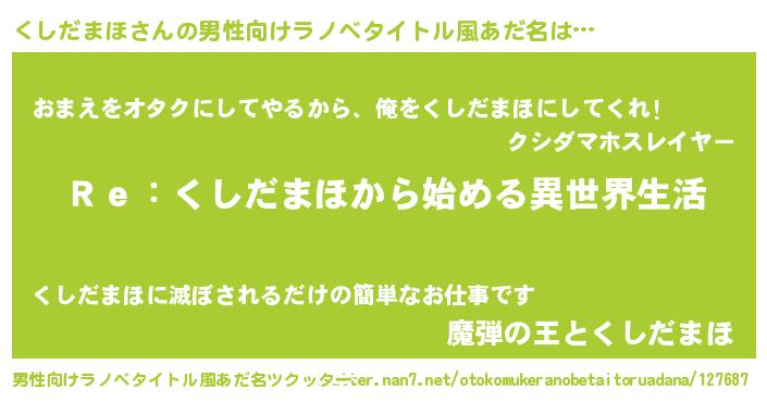 | 伝説のあだ名 | 『救世主となる錬金術士くしだまほ』 |