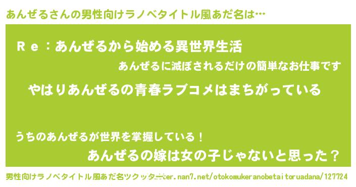 | 女子向けラノベタイトル風あだ名 | 『あんぜるの雑貨屋さん』『闇のあんぜる』 |