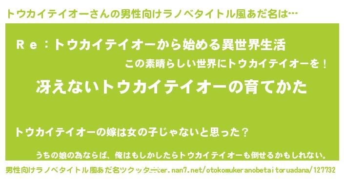 | 女子向けラノベタイトル風あだ名 | 『男装トウカイテイオーの憂鬱な任務』 |