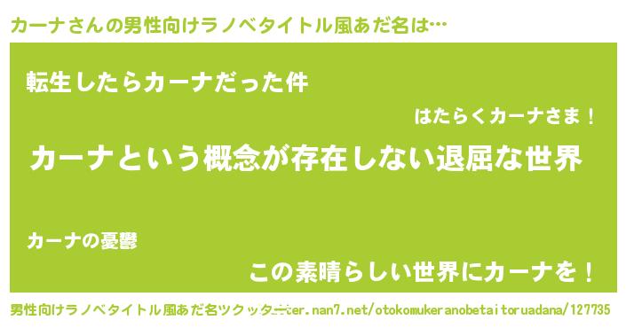 | 意味不明あだ名 | 『永久保存カーナ』『なめこ科カーナ属』 |