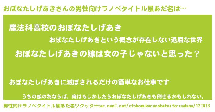 | 女子向けラノベタイトル風あだ名 | 『おぼなたしげあきの卵を拾いまして』 |