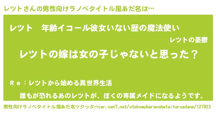 | 女子向けラノベタイトル風あだ名 | 『レツトの卵を拾いまして』 |