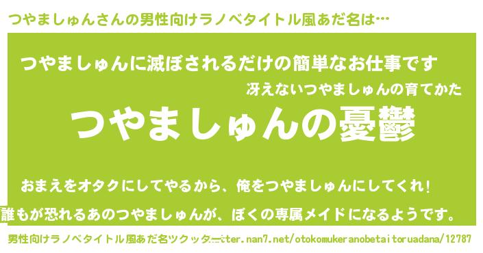 | 女子向けラノベタイトル風あだ名 | 『(仮)つやましゅんのやんごとなき事情』 |