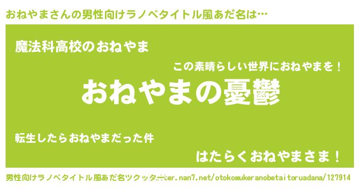 | 女子向けラノベタイトル風あだ名 | 『(仮)おねやまのやんごとなき事情』 |