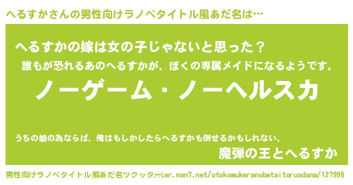 | ヒーロー風カッコイイあだ名 | 『慈愛の使者へるすか』『天弓騎士ヘル』 |