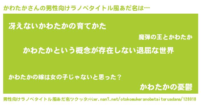| 女子向けラノベタイトル風あだ名 | 『異世界で失敗しない100のかわたか』 |