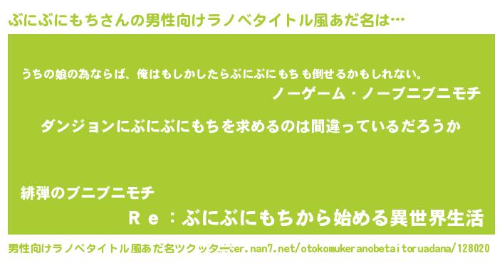 | 女子向けラノベタイトル風あだ名 | 『ぶにぶにもちは平凡を望む』 |