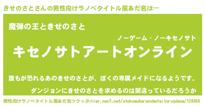 | 女子向けラノベタイトル風あだ名 | 『誰かこのきせのさとを説明してください! ~契約から始まるウェディング~』 |