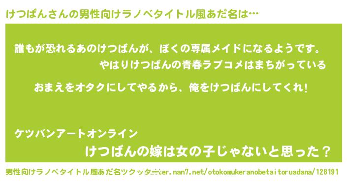 | 女子向けラノベタイトル風あだ名 | 『けつばん夫妻のなれそめ』 |