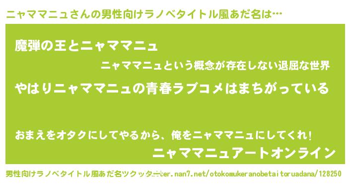 | 女子向けラノベタイトル風あだ名 | 『ニャママニュの雑貨屋さん』 |