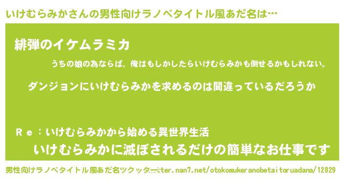 | 胡散臭い通販商品みたいなあだ名 | 『信頼と実績のサプリメント…その名も「いけむらみか」』 |