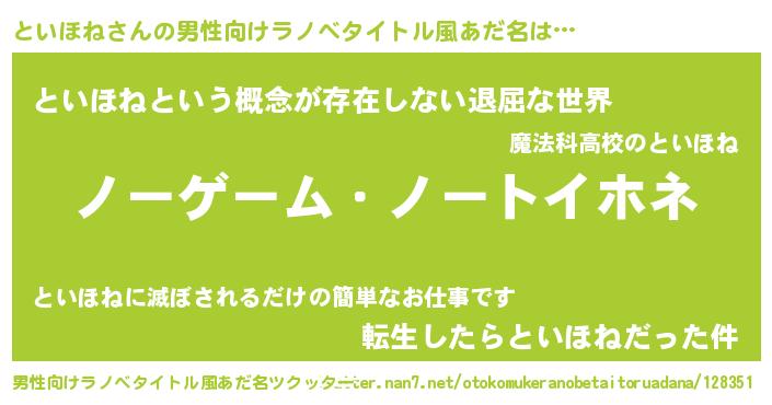 | ヘコむあだ名 | 『といほね(笑)』『牛乳』『といを』 |