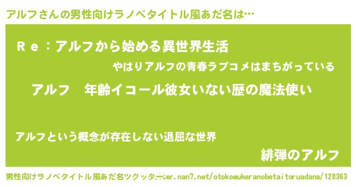 | 女子向けラノベタイトル風あだ名 | 『アルフの玉の輿計画!』 |