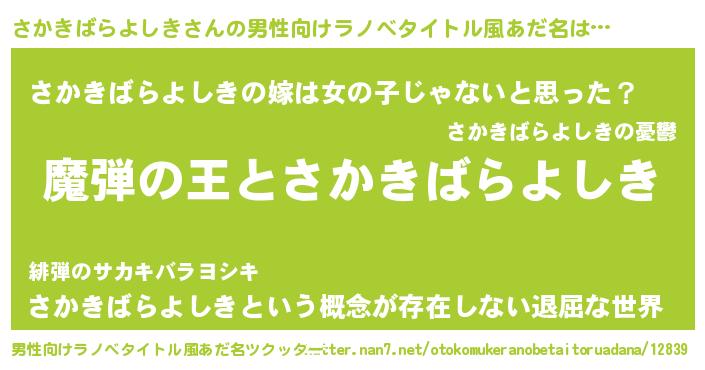 | 女子向けラノベタイトル風あだ名 | 『さかきばらよしきが死なない童話 林檎のさかきばらよしきの診療簿』 |