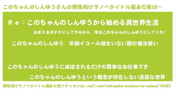 | 女子向けラノベタイトル風あだ名 | 『このちゃんのしんゆうの玉の輿計画!』 |