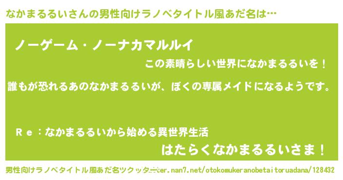 | 女子向けラノベタイトル風あだ名 | 『異世界でカフェなかまるるいを開店しました。』 |