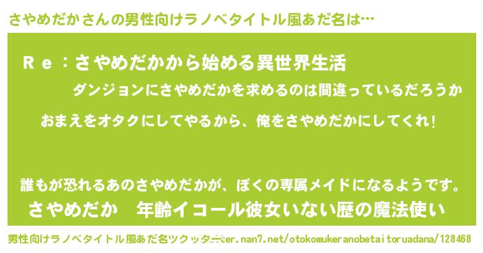| 女子向けラノベタイトル風あだ名 | 『さやめだか夫妻のなれそめ』 |