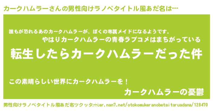 | 胡散臭い通販商品みたいなあだ名 | 『来世でも幸せになれる水素水…その名も「カークハムラー」』 |