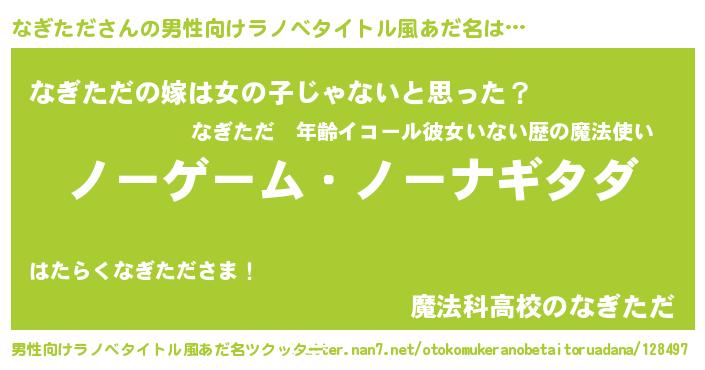 | 女子向けラノベタイトル風あだ名 | 『死神なぎただの再婚』 |