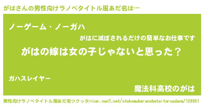| 女子向けラノベタイトル風あだ名 | 『がはの卵を拾いまして』『がは恋絵巻』 |