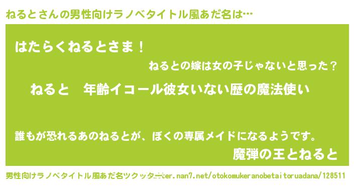 | 女子向けラノベタイトル風あだ名 | 『ねるとの玉の輿計画!』 |