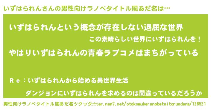 | 女子向けラノベタイトル風あだ名 | 『いずはられんの雑貨屋さん』 |