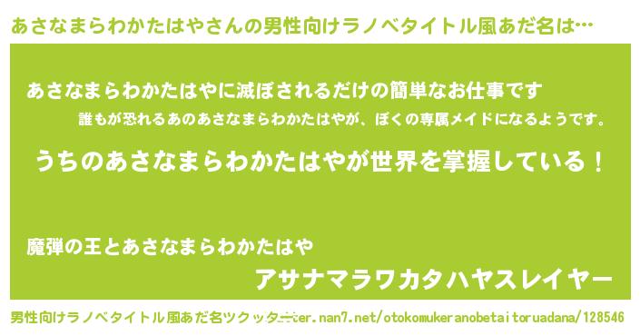 | 女子向けラノベタイトル風あだ名 | 『男装あさなまらわかたはやの憂鬱な任務』 |