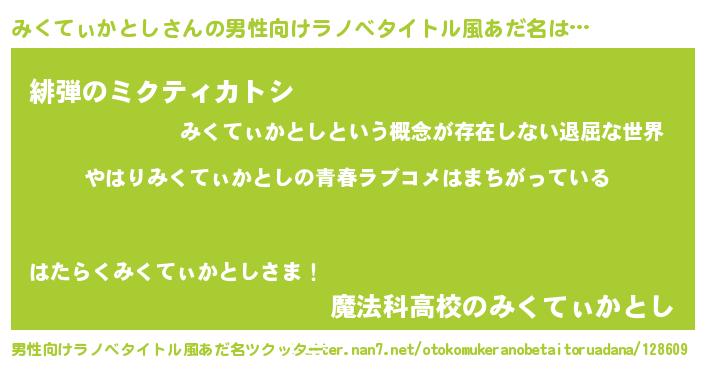 | 女子向けラノベタイトル風あだ名 | 『みくてぃかとし伯爵の花嫁』 |