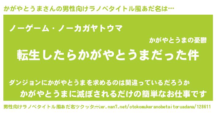 | 女子向けラノベタイトル風あだ名 | 『かがやとうまの玉の輿計画!』 |
