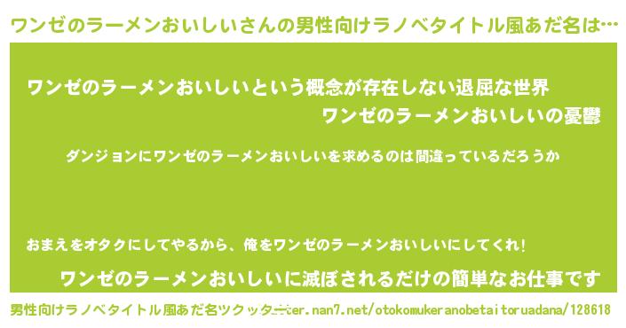 | 女子向けラノベタイトル風あだ名 | 『ワンゼのラーメンおいしいは平凡を望む』 |