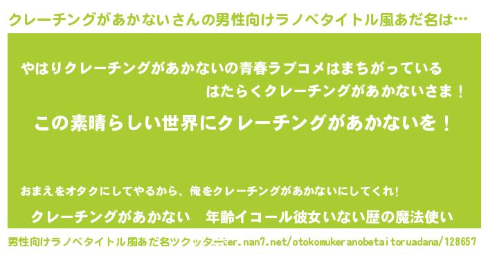 | 女子向けラノベタイトル風あだ名 | 『乙女ゲームの破滅フラグしかない悪役クレーチングがあかないに転生してしまった…』 |
