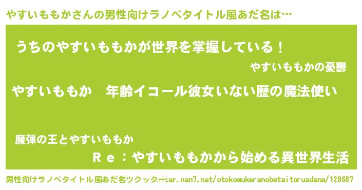 | 女子向けラノベタイトル風あだ名 | 『やすいももかの玉の輿計画!』 |