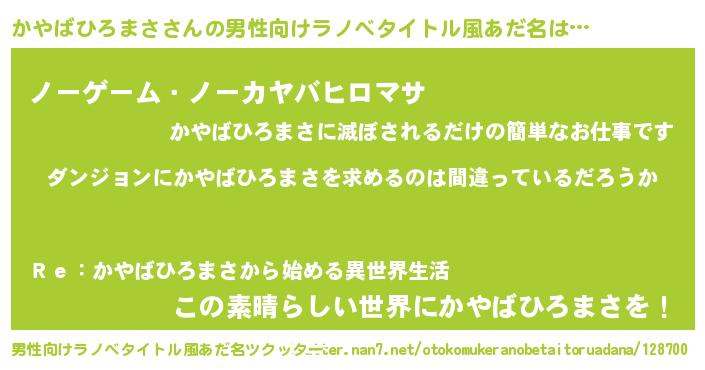 | 女子向けラノベタイトル風あだ名 | 『かやばひろまさの卵を拾いまして』 |