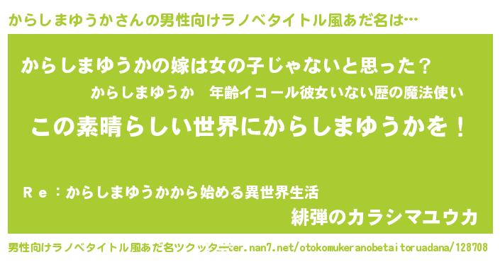 | 胡散臭い通販商品みたいなあだ名 | 『あなたにだけ特別に提供する100年もののヴィンテージワイン…その名も「からしまゆうか」』 |
